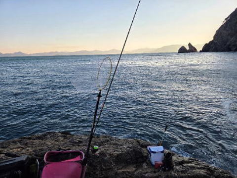 私とFさんは「ボラ見」という磯、師匠はその横の小さな磯、神戸の二人組は「立神」に下りました。
