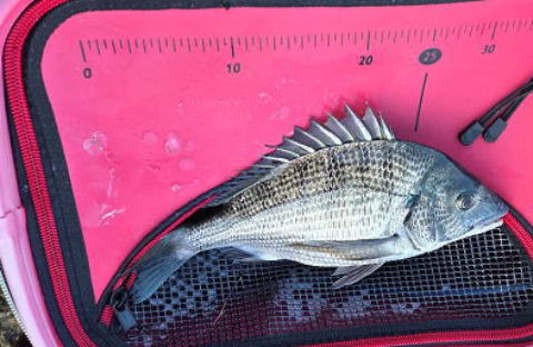 Fさんチヌ35cm2枚、グレ30cmまでを2枚、私は同じようにチヌ35cm2枚、グレ29,26cmでした。