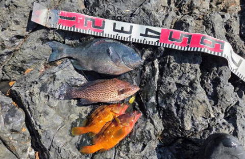私の今日の釣果はグレ34cm、オオモンハタ30cm、アカハタ28,25cm、キバンドウ40cm(放流)でした。