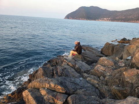 野地島の船着きで竿を出すM君
